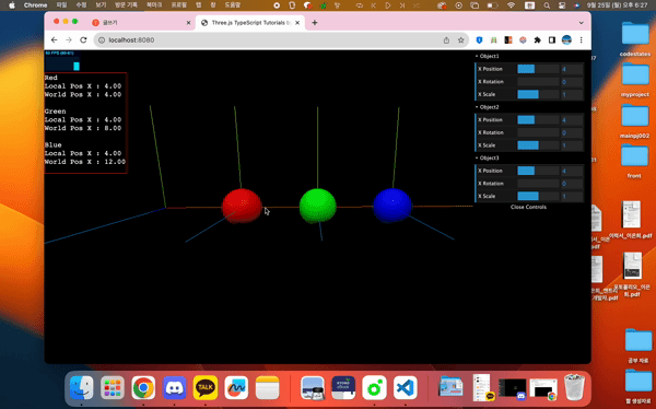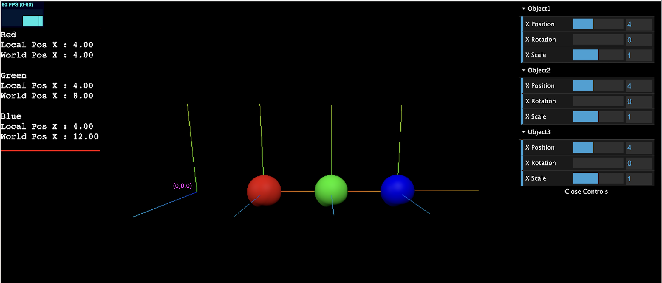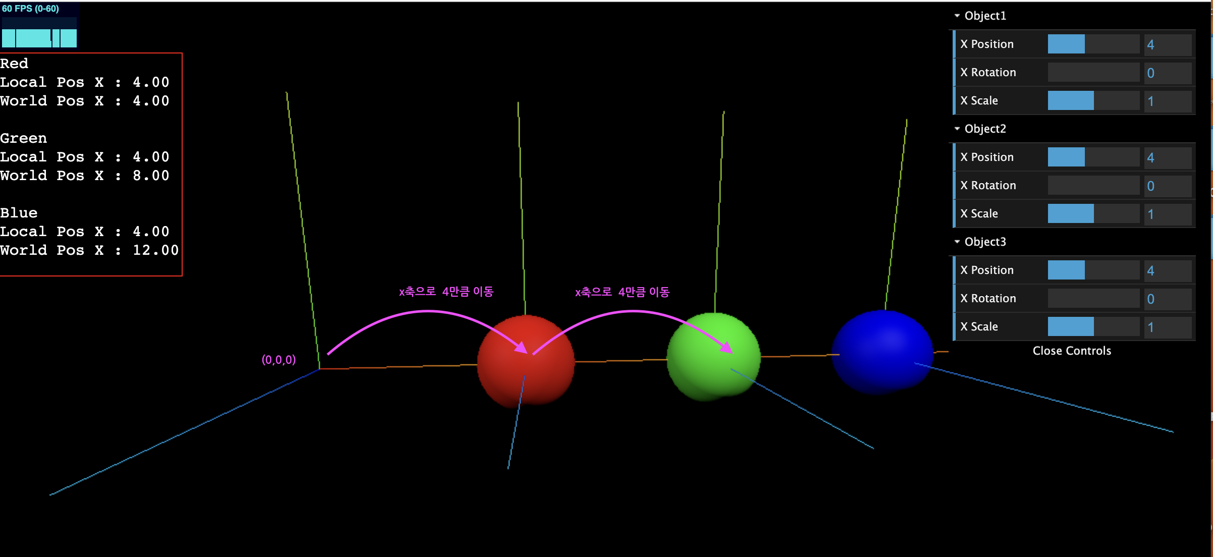 위에 코드는 빨간공의 자식, 초록공. 초록공의 자식, 파랑공으로 구성된 오브젝트 3D 계층 구조를 만든 코드 일부분입니다.