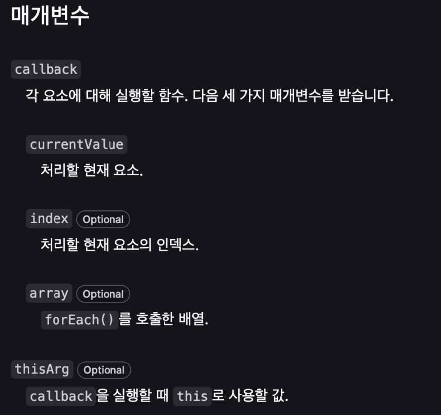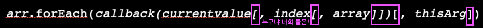 그래서 .forEach를 부가적인 매개변수 활용없이 구현한다면 아래와같이 표현할 수 있습니다.