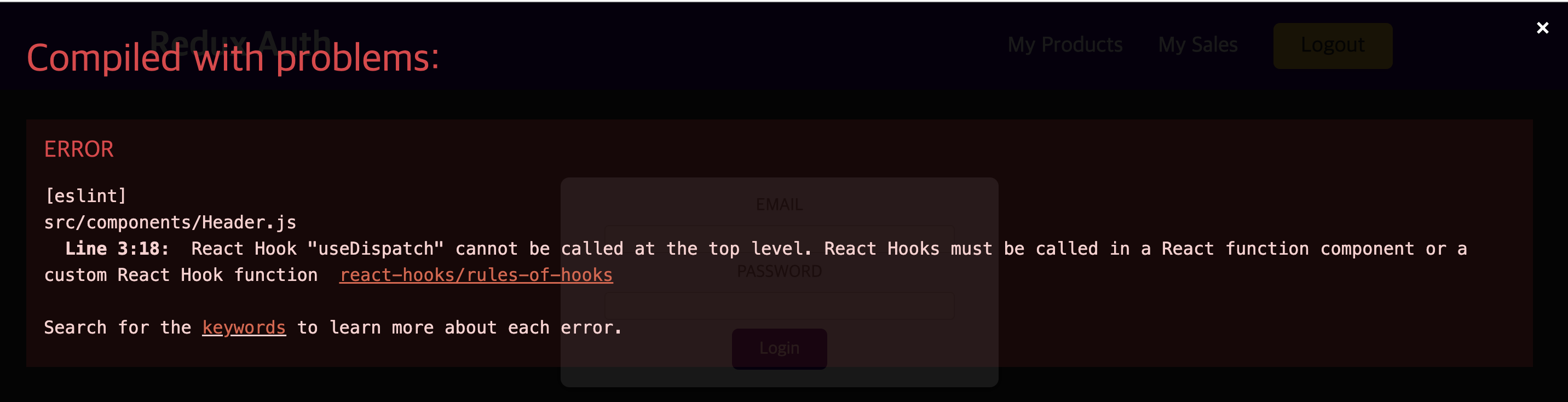 react hook useDispatch 를 사용중 다음과 같은 오류를 만났습니다. 최상위 수준에서 React Hook "useDispatch"를 호출할 수 없습니다. React Hook은 React 함수 컴포넌트 또는 사용자 정의 React Hook 함수에서 호출해야합니다.