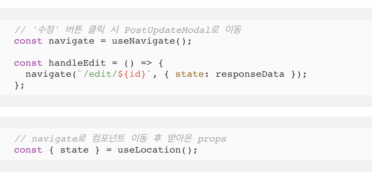 프로젝트 중 상세 페이지 내에서 자신이 작성한 대댓글이나 댓글 수정하기 버튼을 누르면 해당 댓글의 정보를 해당 url 로 이동하면서 넘겨줘야하는 상황이 생겼습니다. usenavigate 기능 중 url 이동시 데이터를 같이 넘겨주는 기능이 있어 이를 적용했습니다.