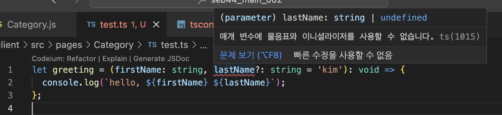 let greeting = (firstName: string, lastName?: string): string => {